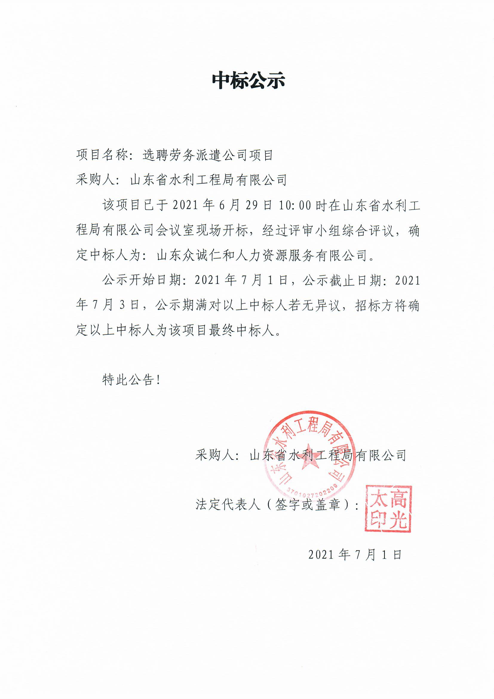 選聘勞務(wù)派遣公司項(xiàng)目中標(biāo)公示