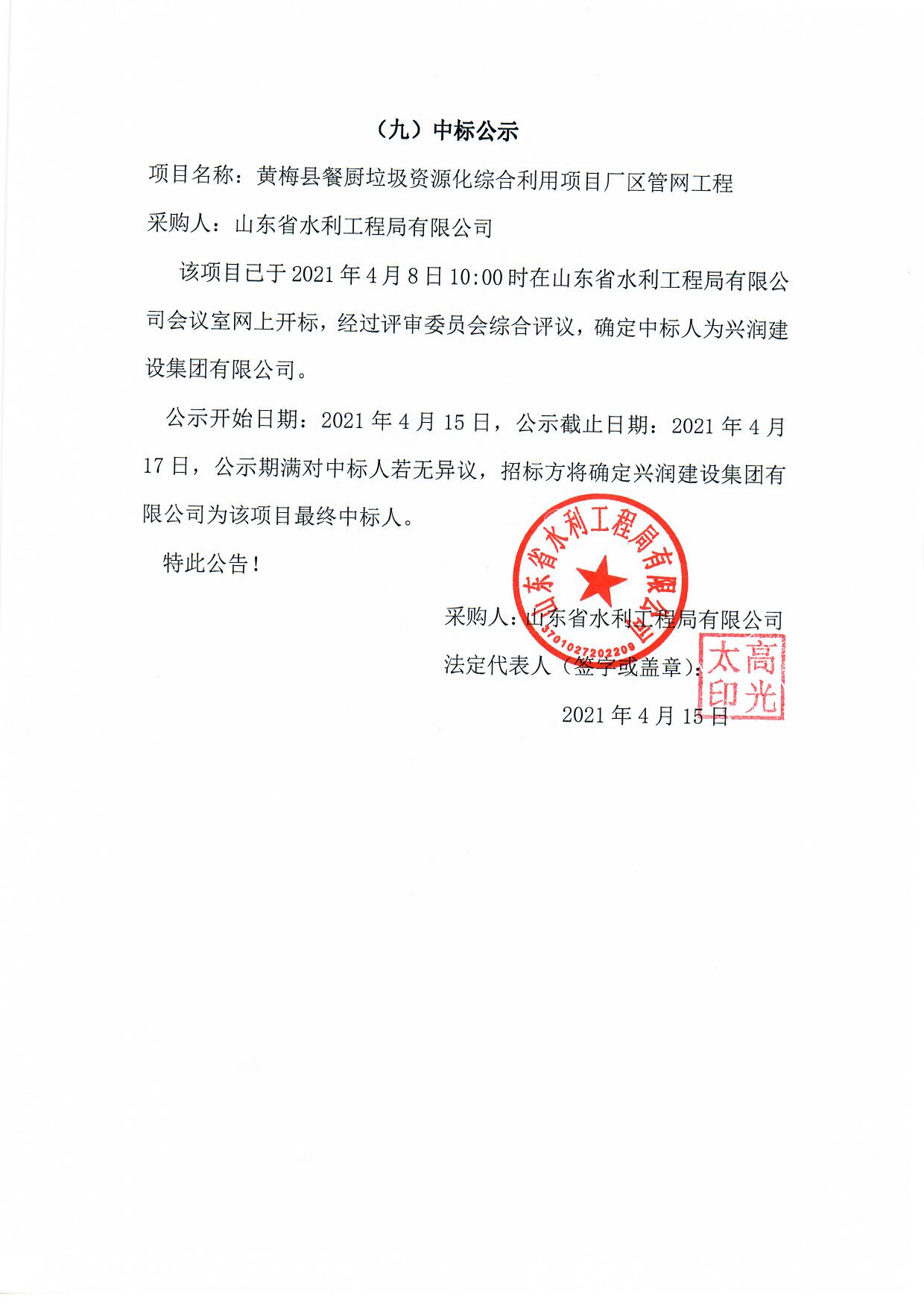 山東省水利工程局有限公司餐廚垃圾處理廠智能信息化管控平臺中標候選人公示