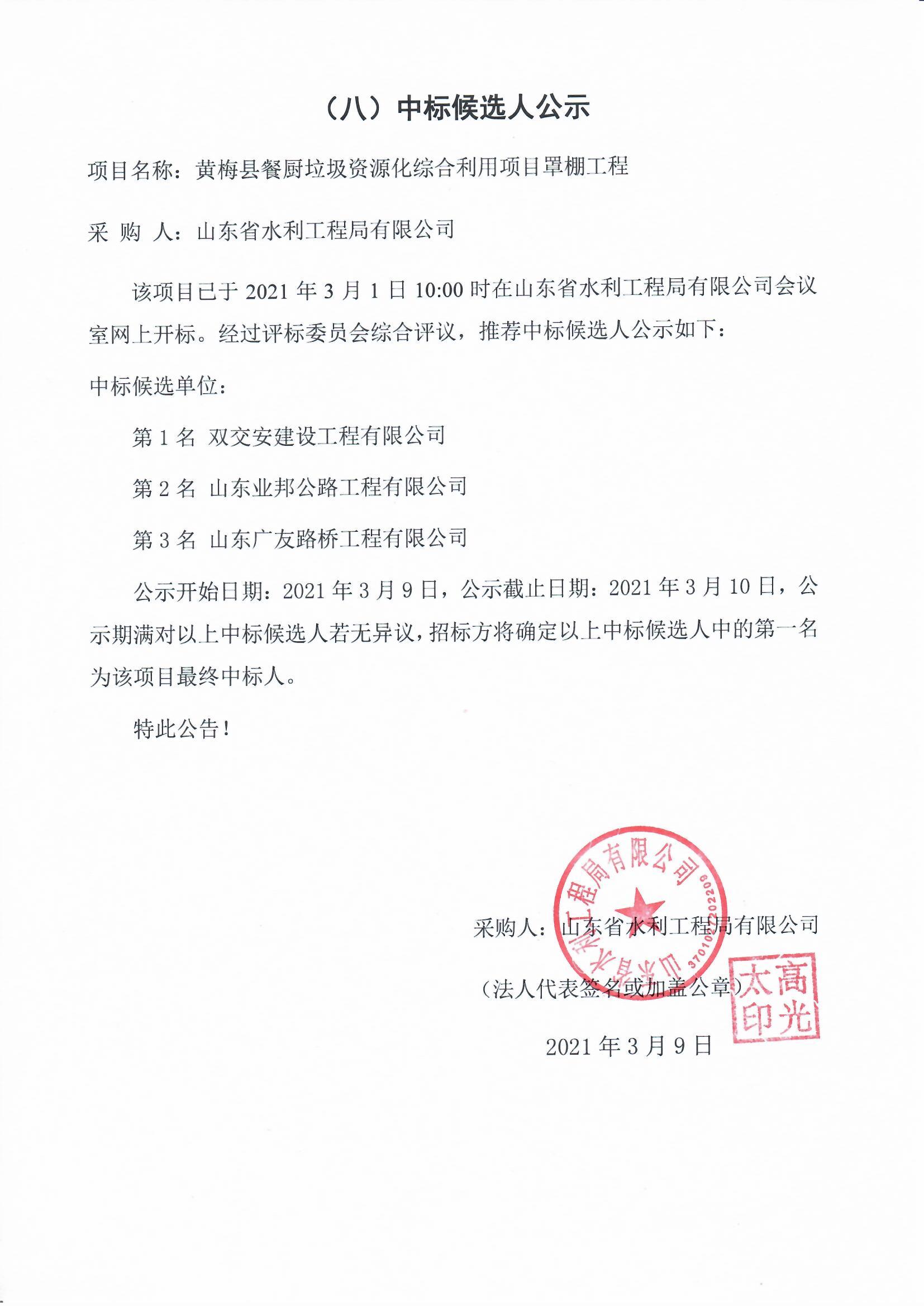 黃梅縣餐廚垃圾資源化綜合利用項(xiàng)目罩棚工程中標(biāo)候選人公示