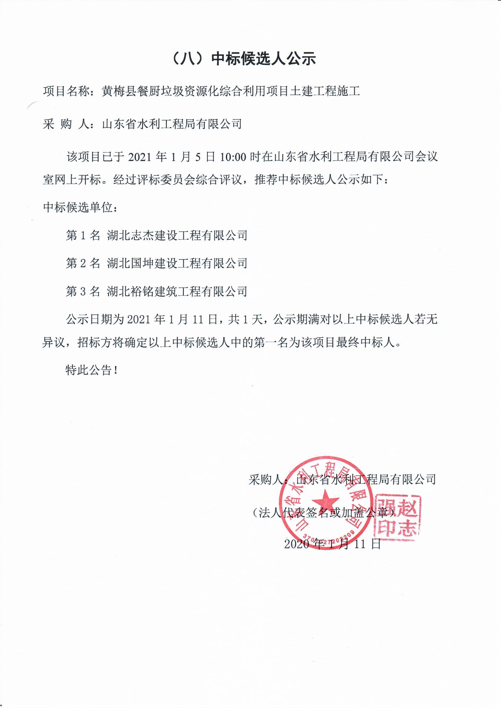 黃梅縣餐廚垃圾資源化綜合利用項(xiàng)目土建工程施工中標(biāo)候選人公示