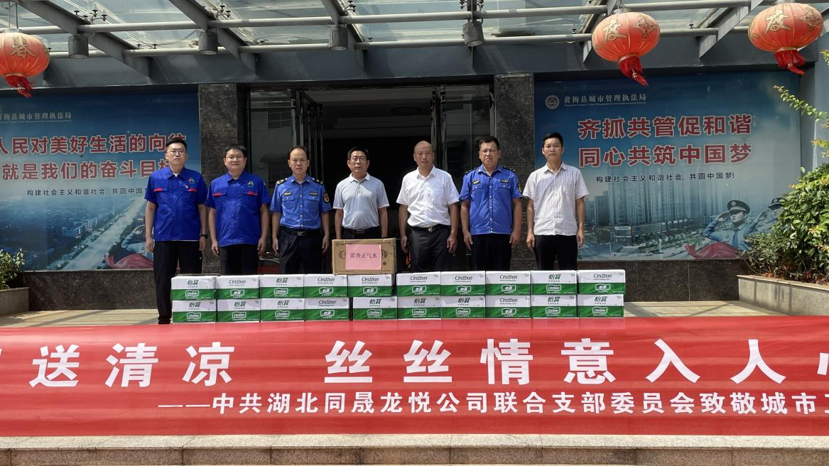 7月28日,為了表達(dá)對(duì)在酷暑中堅(jiān)守一線城管執(zhí)法人員的敬意,湖北同晟龍悅公司聯(lián)合黨支部在董事長(zhǎng)張峰同志的帶領(lǐng)下,為奮戰(zhàn)在一線的“城市衛(wèi)士”開展送清涼活動(dòng)。